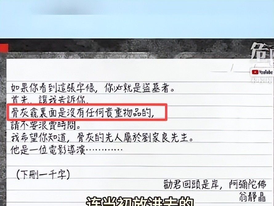 16. 早在2013年刘家良离世下葬之际,翁静晶出于直觉,在墓穴中附上一张字条:“此处并无贵重物品,仅有先人骨灰留存”。
